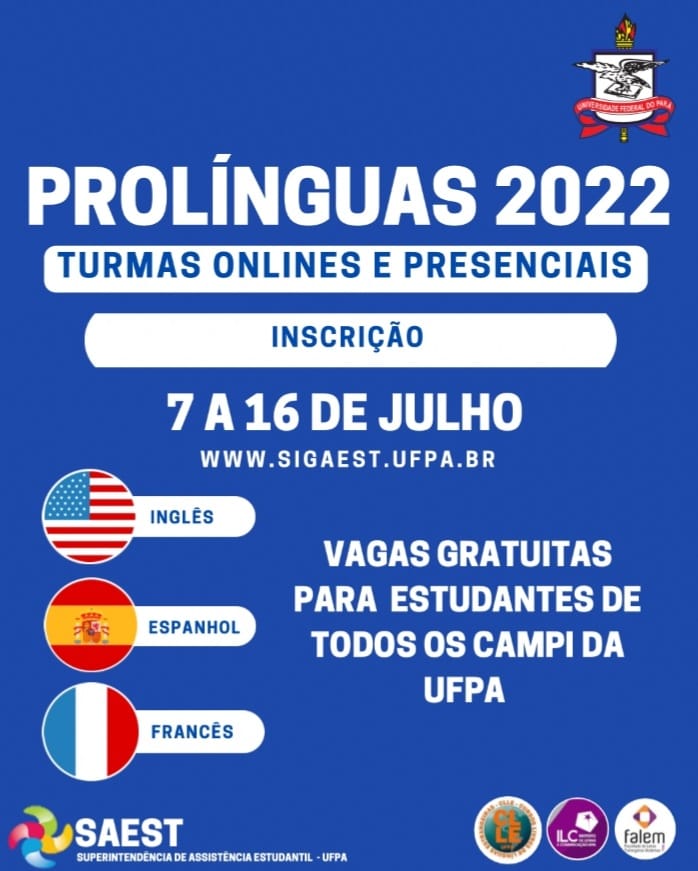 Você, que estuda graduação em qualquer campus da UFPA, já pode se inscrever para vagas gratuitas nos Cursos Livres de Inglês, Francês ou Espanhol. Pode-se escolher para participar das turmas virtuais ou presenciais. O projeto Pró-Línguas é uma parceria da Saest/UFPA com a Faculdade de Línguas Estrangeiras Modernas do ILC/UFPA para ofertar formação em línguas estrangeiras a estudantes em situação de vulnerabilidade.
